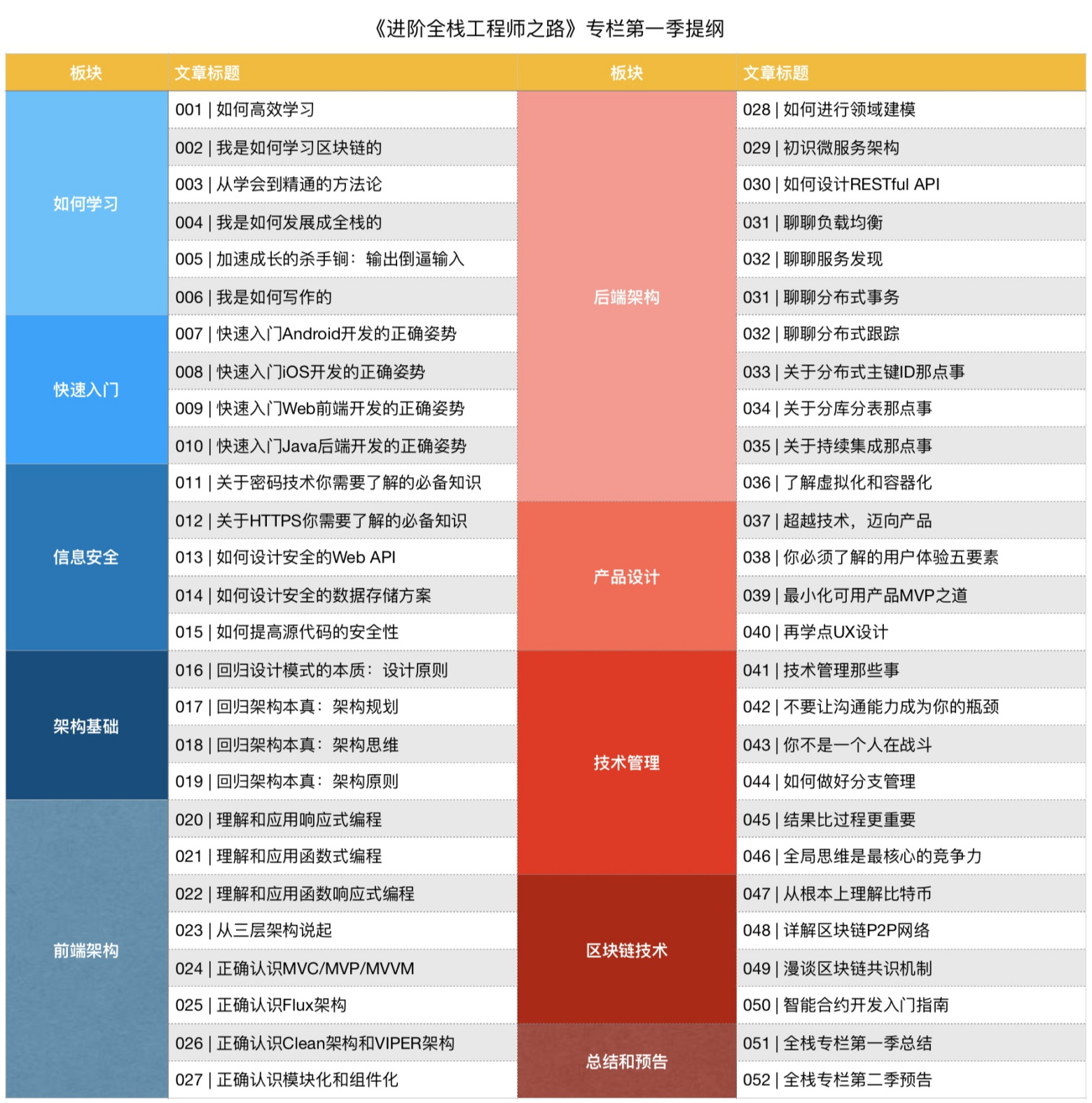那么,临近2018之际,首先,对专栏提纲进行了全新的规划,总共划分为了如何学习、快速入门、信息安全、架构基础、前端架构、后端架构、产品设计、技术管理、区块链技术九大板块,具体提纲如下: