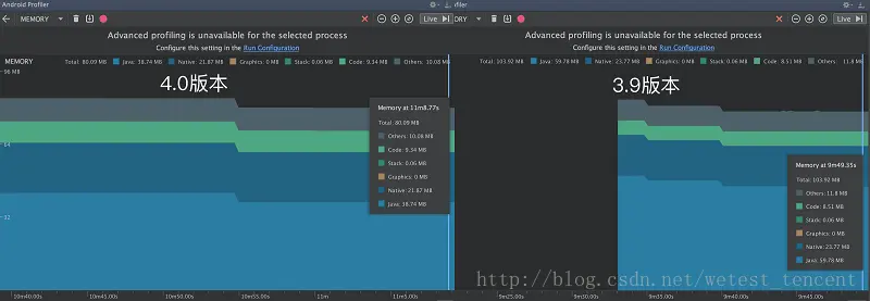 在场景二中:4.0版本占用 45.5M,而3.9版本占用 87.4M。减少了41.9M内存。