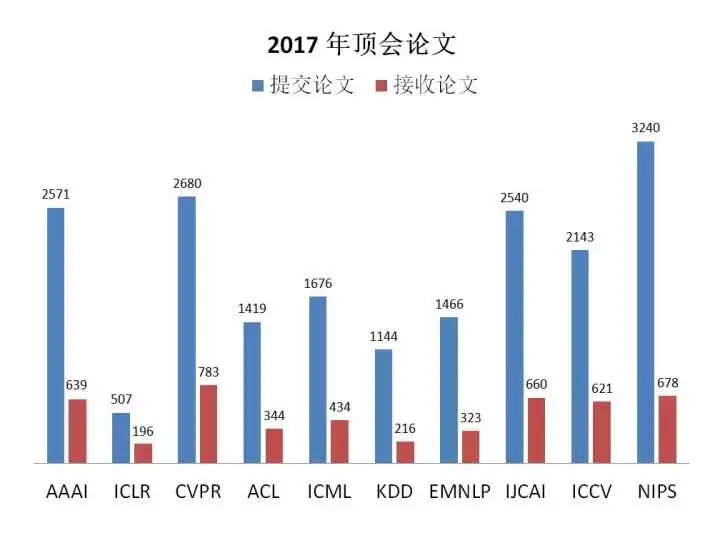 MAREK REI 更多关注的是自然语言处理与 ML 会议,而其它如 CVPR、ICCV 和 KDD 等计算机视觉顶会与数据挖掘顶会都没有涉及到。因此我们可以补充一些 2017 年的论文提交与接收情况,如下展示了 11 项顶会的论文提交与接收情况。其中除了上述的 NIPS,AAAI 和 CVPR 等大会也非常值得我们关注。