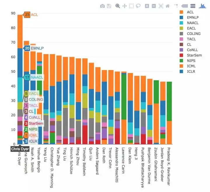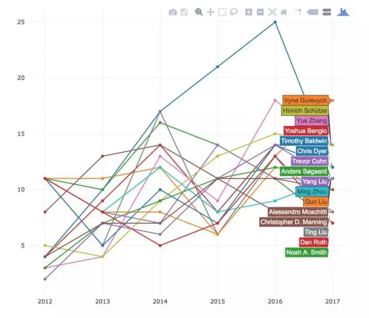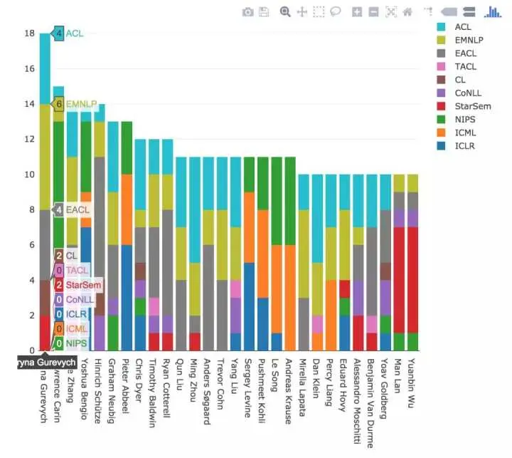 看一下 2012-2017 年的累积统计结果,Chris Dyer(DeepMind)遥遥领先,紧随之后的是 Iryna Gurevych(达姆施塔特工业大学)和 Noah A. Smith(华盛顿大学)。Lawrence Carin(杜克大学)、Zoubin Ghahramani(剑桥大学)和 Pradeep K. Ravikumar(卡内基梅隆大学)发表的论文主要在机器学习会议,而其他人则在 NLP 和机器学习之间平衡。