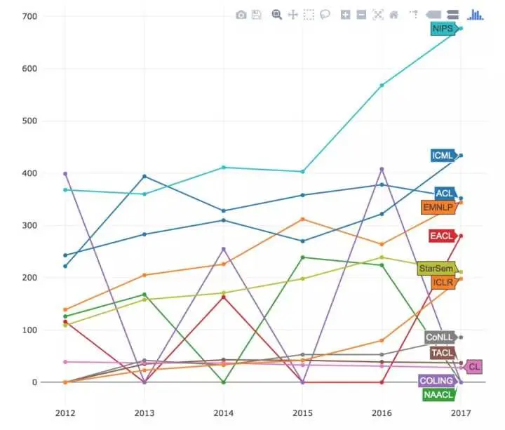 2017 年是自然语言处理(NLP)和机器学习(ML)非常高产的一年。两个领域持续增长,会议论文数量纷纷打破记录。本文中我将根据个人作者和组织进行更详细的细分。统计信息来自以下会议:ACL、EMNLP、NAACL、EACL、COLING、TACL、CL、CoNLL、Sem+SemEval、NIPS、ICML、ICLR。与上年不同,这次把 ICLR 包含了进来,它在过去两年飞速发展为一个很有竞争力的会议。此外,机器之心也将我们统计的会议结果添加到该报告中,并作一定的分析。