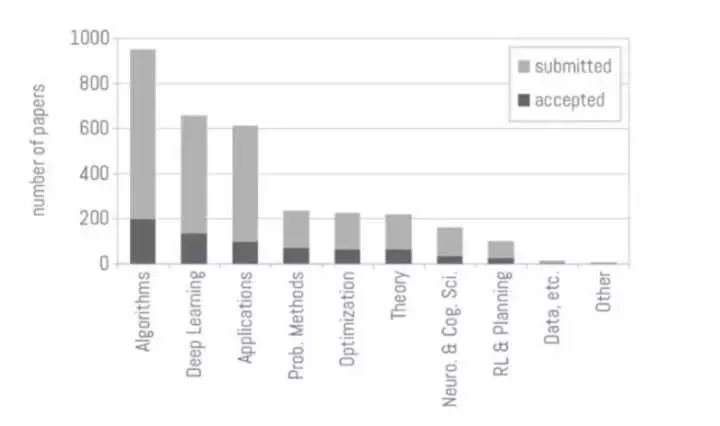 其实从接收论文的情况我们就能看出一些趋势,因为自 2015 年来 NIPS 的接收论文就有很大的提升,这与机器学习和深度学习的崛起有很大的关系。神经信息处理系统大会(Neural Information Processing Systems,NIPS)是机器学习与计算神经科学方面的顶会,本届 NIPS(31st)大会注册人数超过 8000 人;共收到 3240 篇提交论文。其中有 20.9% 被组委会接收;议程包括 679 个 Poster 演讲,40 个长演讲(Oral), 112 个短演讲(Spotlight)。若根据 NIPS 2017 提交论文数量进行分析,最热门的三个子领域为算法、深度学习和应用,由于深度学习目前并没有一种给我们美感的完整体系,所以很可能这一领域的研究在 2018 年将会继续进行下去。