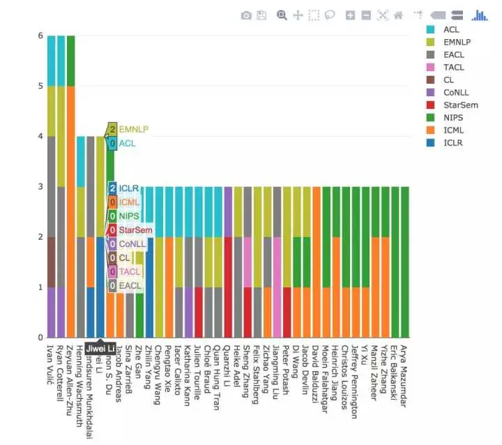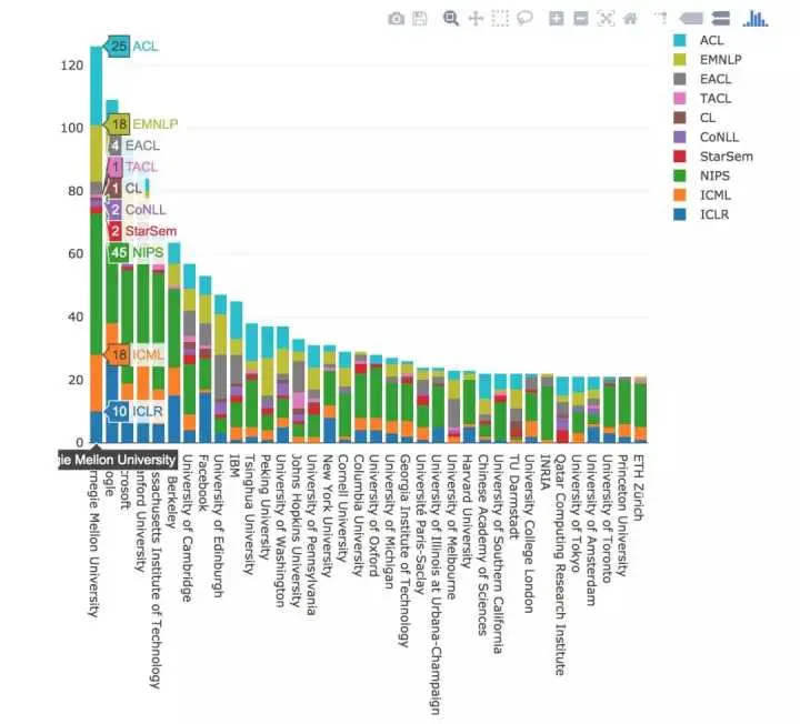 MAREK REI 的分析是通过爬虫自动抓取会议官网和 ACL 选集的发表信息而完成的,因此分析主要集中在自然语言处理。MAREK REI 表示作者姓名一般列在议程之中,因此可轻松提取;但是机构名称相对麻烦,需要从 PDF 直接抓取。而我们添加的信息主要来源于 2017 年报道过的人工智能方面的顶会,因此它正好可以补充原作者提供的信息。