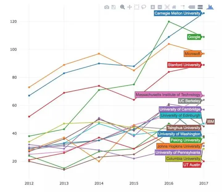 看一下 2012-2017 年的整段时期,卡内基梅隆依然是其中的佼佼者,而微软、谷歌和斯坦福紧随其后。