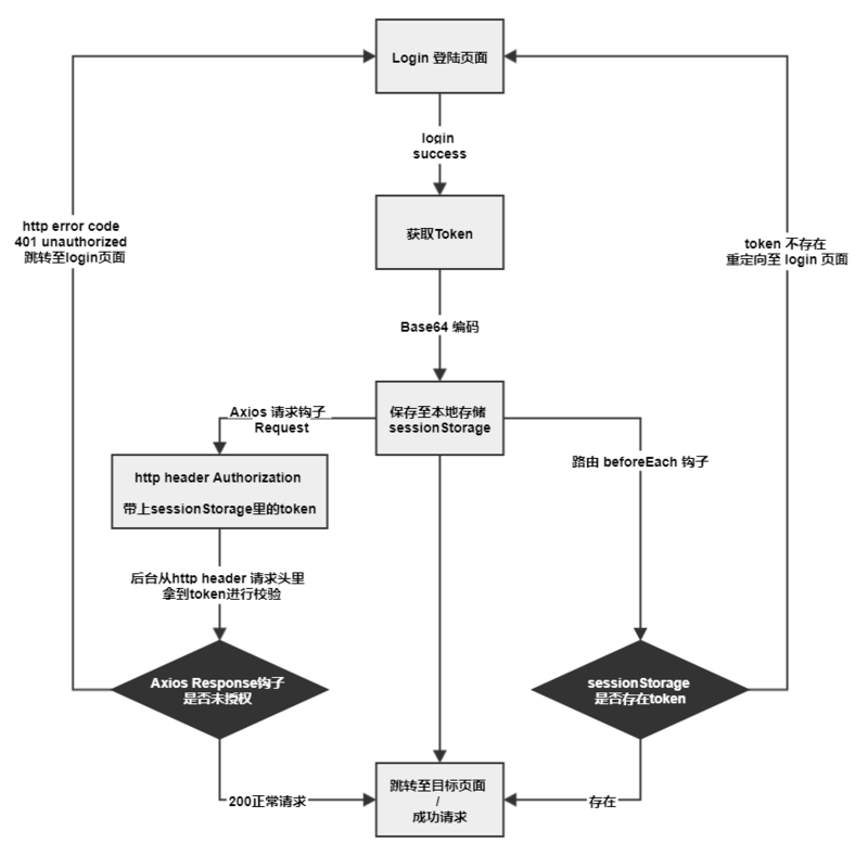 4.请求拦截:后台拿到token后对每个请求进行校验,若校验失败返回401,前端response钩子里统一catch error 跳转至登陆页面。