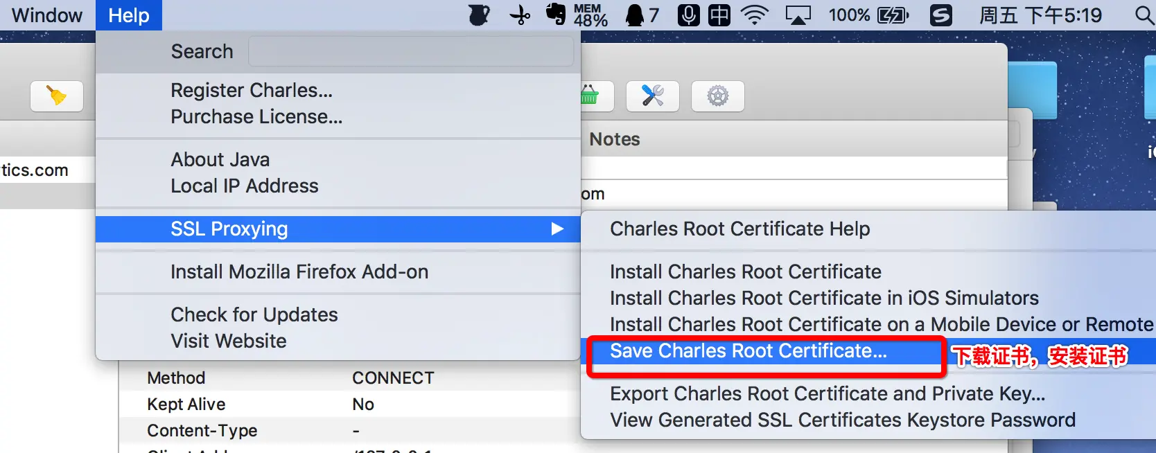 (2)安装SSL证书到手机设备 点击 Help -> SSL Proxying -> Install Charles Root Certificate on a Mobile Device