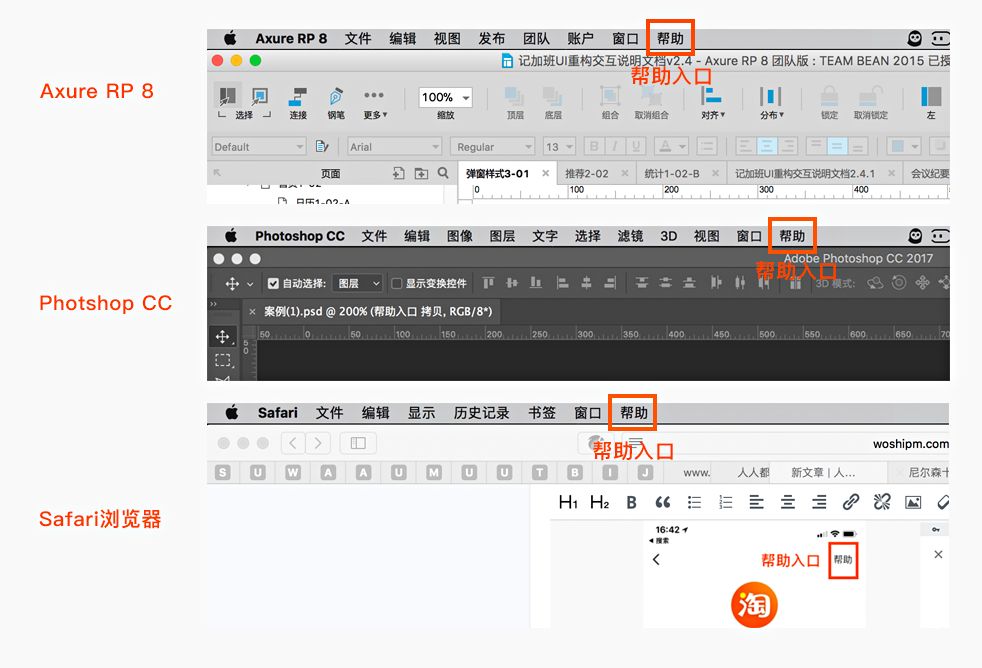 比如mac上一些常用的大型软件:原型制作工具Axure RP 8软件、图像编辑软件Photshop CC以及mac上的Safari浏览器,在顶部状态栏上都有有一个“帮助”的入口,也体现了帮助文档的必要性,所以,不管是什么样的产品都要给用户提供一个帮助的入口,用来解决用户操作过程中遇到的问题,如下图: