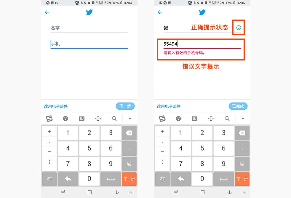 例如Twitter注册页面的错误提示:用户在注册Twitter账号时,第一步要输入名字和手机号码,当用户输入正确的时候,输入框后边会有绿色的对勾圆圈,提示用户输入正确,可以进入下一步操作了,而当用户输入错误的时候,输入框会变为红色并且在下方出现红色字的错误提示,这样让用户很清楚的知道用户输入错误以及错误的原因,这样用户就知道怎么修改了,这也是容错原则的一种体现,如下图: