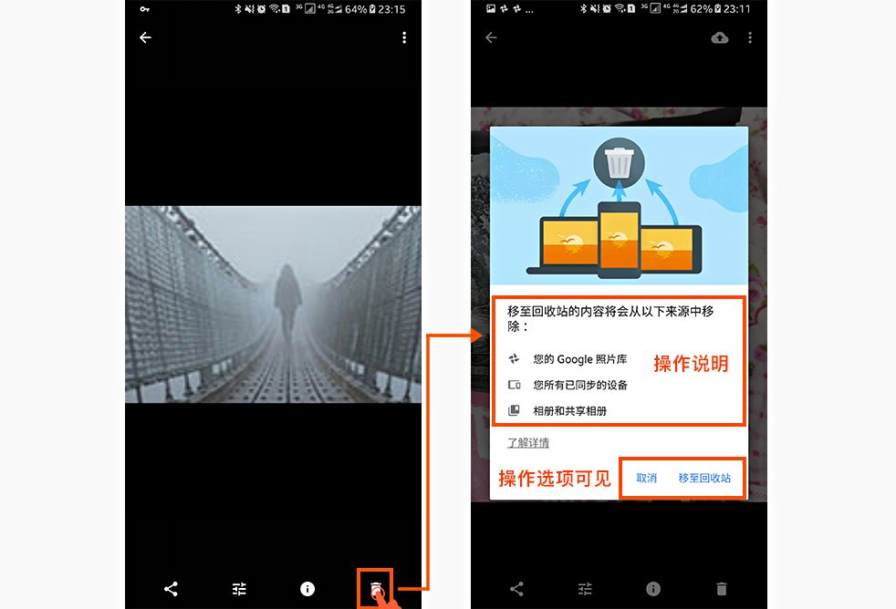 比如谷歌相册中的删除照片操作:用一个类似垃圾桶的“图标”标识删除功能,对于用户来讲是有一定的认知负荷的,且点击“删除”之后用户对于造成的后果及影响也不清楚,因此,删除之后出现弹窗提示很有必要,此弹窗清除的写明了删除之后的影响、后续的帮助说明以及操作的选项,弹出框的出现很好的减少了用户前后的记忆,这就是易取原则的体现,如下图: