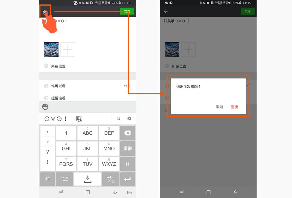 比如安卓版微信发朋圈动态时,点击返回按钮出现的提示弹窗:弹出框方式会增加不可逆操作的难度,当用户发一条动态一半的时候,因为误操作或者其它退出当前状态的时候,使用弹窗是是个不错的选择,因为用户这个操作会让之前辛苦编辑的内容删除找不回,想要再发只能从头开始,对用户造成损失比较大;这就是防错原则的另外一种体现,如下图: