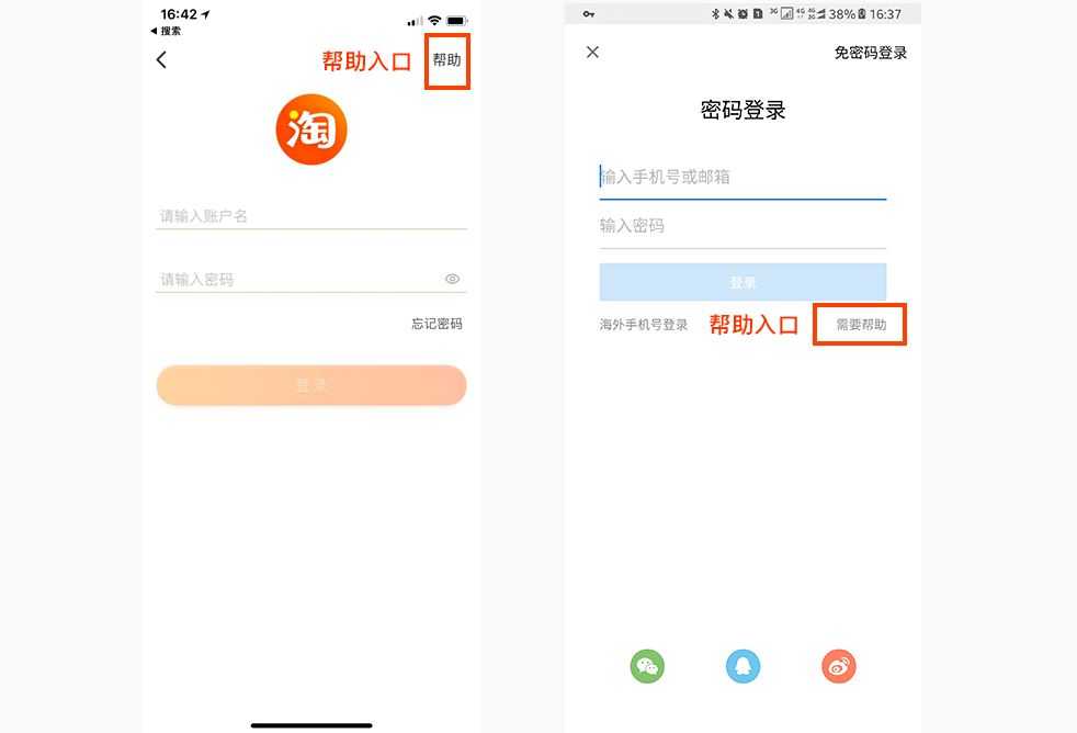 例如淘宝APP和知乎APP登录页面的帮助入口:在比较重要的功能入口处有必要提供相应的帮助入口,来解决用户在操作功能过程中遇到的问题或者反馈问题的入口,不要让用户在出现问题时手足无措,不知道怎么办,具体看下图: