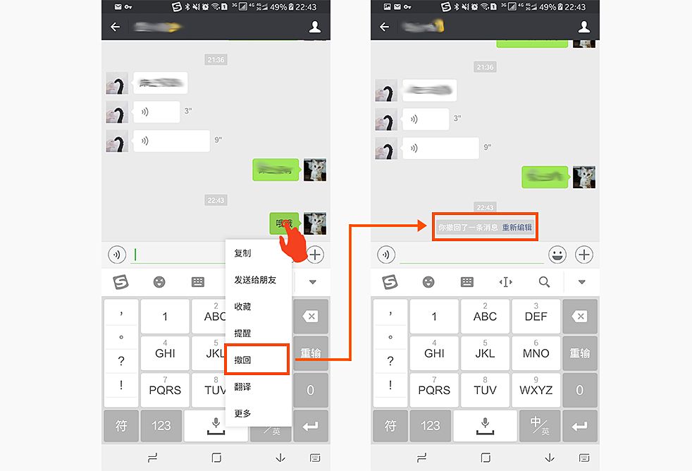 比如微信聊天中的撤回功能:两个人在微信中聊天的时候,我发了一条消息或者表情,突然觉得不合适,我可以在长按这条消息或者表情,在出现的选择框中选择撤回,然后重新编辑发送,来避免一时没想好而错发消息可能给对方或者自己造成困扰,这就是用户可控原则,具体看下图: