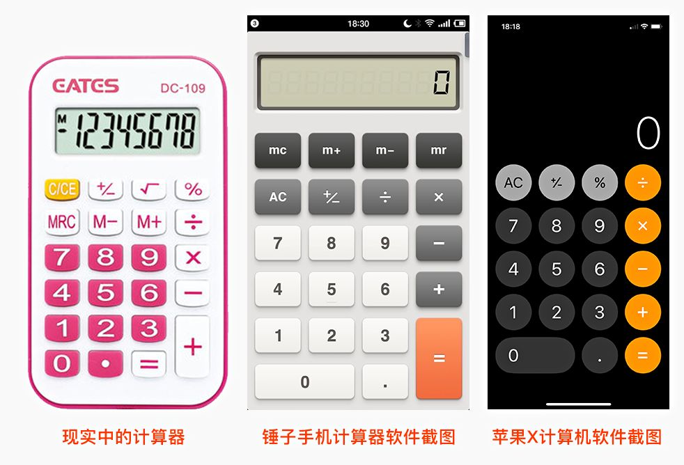 比如计算机的软件界面设计:现在我们手机中的计算器软件设计界面,基本上跟我们现实中使用的计算器的样式差不多,下图左一是我们现实中是使用的计算器,左二、三依次为锤子手机和苹果X自带计算器软件的界面,真的是很相似,这样设计能让用户很快上手,易于操作,因为现实生活中用户已经很熟悉计算器的使用方法了,这就是环境贴切原则: