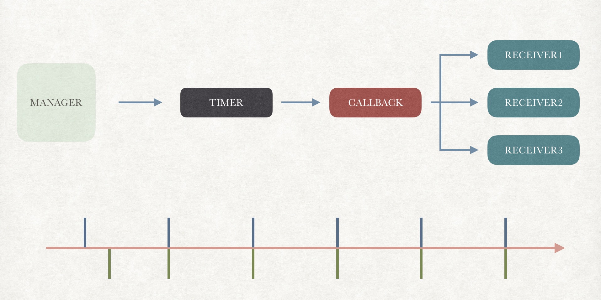 一套功能方案设计的目的是为了简化逻辑流程,隐藏实现细节,尽可能少的暴露接口。普通的倒计时是调用方直接使用定时器实现规律性回调,定时器需要持有调用方的信息。而倒计时设计隐藏了定时器的实现细节,只需调用方提供回调,其余的耦合关联由管理类来完成,类似的设计有Notification和Observer等