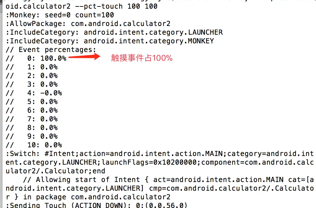4、 --pct-touch <percent> 指定触摸事件占总事件的比例,如果想Monkey 产生的所有事件都是触摸事件,可以指定 percent 为100%,示例: