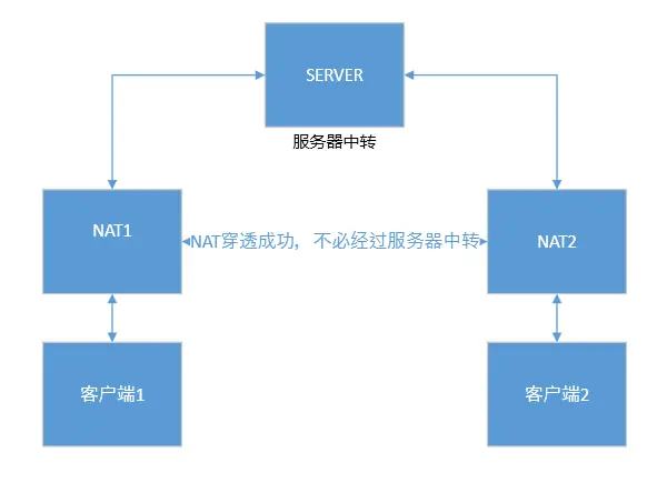 一种可行的方案,是利用一个信令服务器,先获取客户端暴露在NAT上的IP:PORT信息,再协调两个客户端,朝其NAT上暴露的IP:PORT发送信息。由于处于NAT(这里设为NATA)后的机器向另一个NAT(这里设为NATB)后的设备发送信息了,NATA就会允许NATB后的主机的数据。反之亦然。