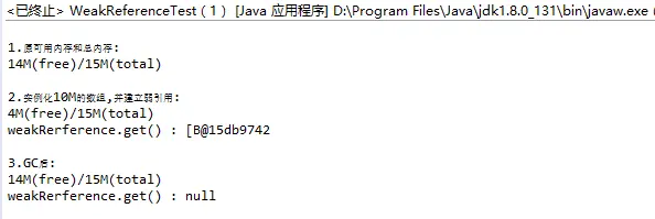 如果一个对象只具有弱引用,无论内存充足与否,Java GC后对象如果只有弱引用将会被自动回收。
