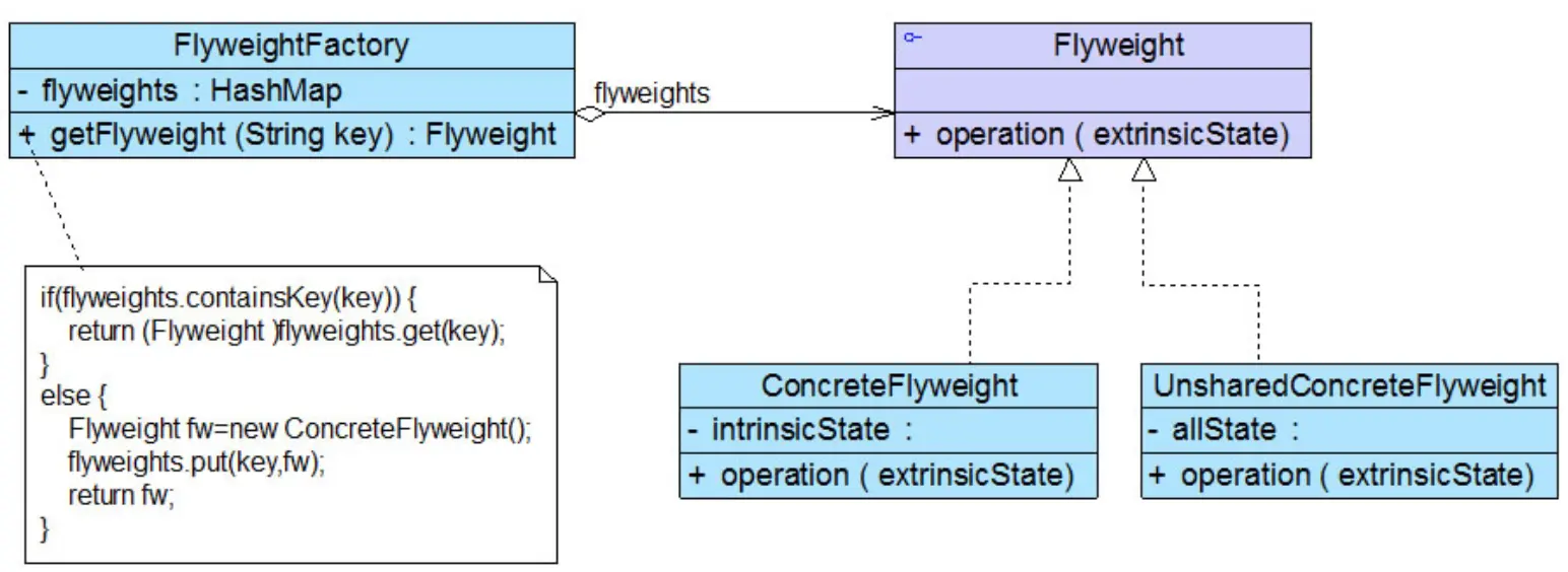 - FlyweightFactory(享元工厂类):享元工厂类用于创建并管理享元对象,它针对抽象享元类编程,将各种类型的具体享元对象存储在一个享元池中,享元池一般设计为一个存储“键值对”的集合(也可以是其他类型的集合),可以结合工厂模式进行设计;当用户请求一个具体享元对象时,享元工厂提供一个存储在享元池中已创建的实例或者创建一个新的实例(如果不存在的话),返回新创建的实例并将其存储在享元池中。