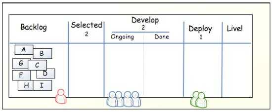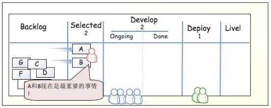 现在假设 A、B 两个任务已经分别被不同的开发人员处理了,那么这些任务就应该移动到 Ongoing 中,同时,产品经理可以从 Backlog 中挑选出 2 个优先级较高的需求到 Selected 中。这样就保证 Selected 与 Develop 都达到了 WIP 的上限。