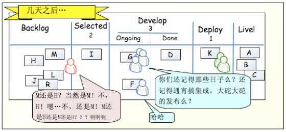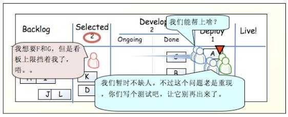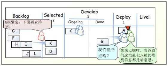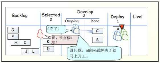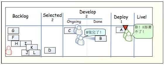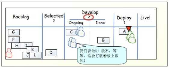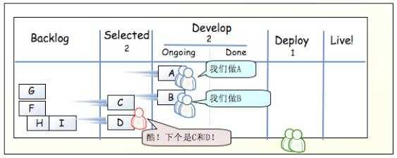 部署人员就可以将 A 从 Done 中移动到 Deploy 中,表示部署人员正在做这件事情。同时,做完了 A 任务的开发人员可以再做其它新任务,只需从 Selected 中移动到 Ongoing 中,移动这件事情不是开发人员随意操作的,而是有项目经理负责的。产品经理发现 Selected 中只有一个 D,就可以考虑放入一些新的需求了。