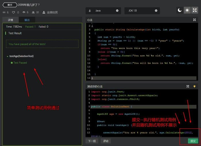 5、提交 -- 执行随机测试用例 -- > 失败/成功 --> 修改代码后继续试招提交/查看并对比大家的心法