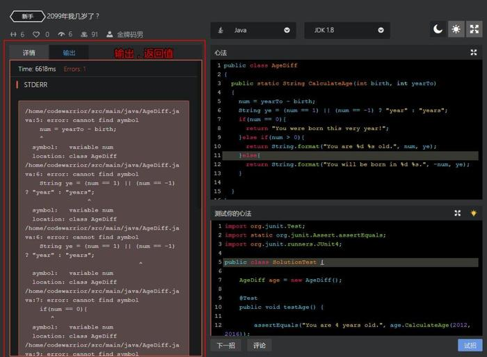 4、查看输出返回值 --> 失败/成功 --> 修改代码后继续试招/提交