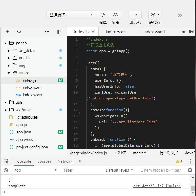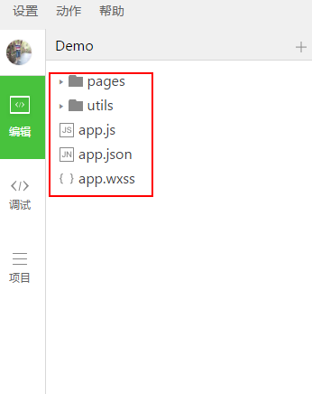 pages---顾名思义,主要页面,当然里面每个页面一个包,每个页面包里面全是和页面相关的wxml , wxss , js , json 。json是补充配置文件。 utls ---工具类。 app.js 程序入口文件,用户获取用户信息,文件存储状况等。 app.json 全局配置文件 app.wxss 公共样式