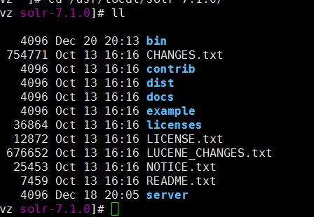 下载solr7.1后解压至需要放置的目录,我放在/usr/local/solr-7.1.0下,如下图: