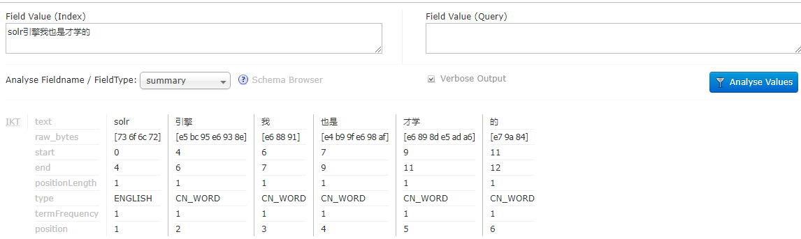配置完成需要重启solr引擎,sudo /usr/local/solr-7.1.0/bin/solr restart -force。 说明: (1)type="text_ik",是引入IKAnalyzer模块时的name配置的,下面测试solr的中文分词如下图: