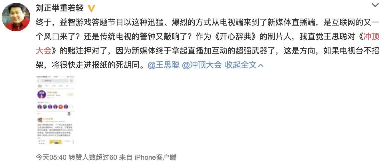 在冲顶大会引爆微博后,连《开心辞典》的制片人都不禁发出感叹。这会是颠覆传统模式的又一个风口。