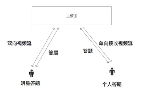 • 明星答题。第一轮就被淘汰的观众,往往就没有继续观看下去的兴致了。如果明星参与答题,观众就有继续观看下去的动力。而且,明星答题是推广App的有效手段。饭局狼人杀刚上线就上App下载排行榜,马东和一众奇葩说明星每晚视频直播狼人杀,功不可没。明星答题场景下,明星需要发送自己的视频流,而且必须是低延时的互动。否则观众看到的明星画面和自己本地时间相差几秒钟,答题节奏步调就不统一了。在直播架构上,明星与主频道进行视频连麦,发送自己的视频流。同时,这些流都支持通过rtmp进行社会化分享。类似还可以衍生出,跨直播间PK答题、1对1PK答题。