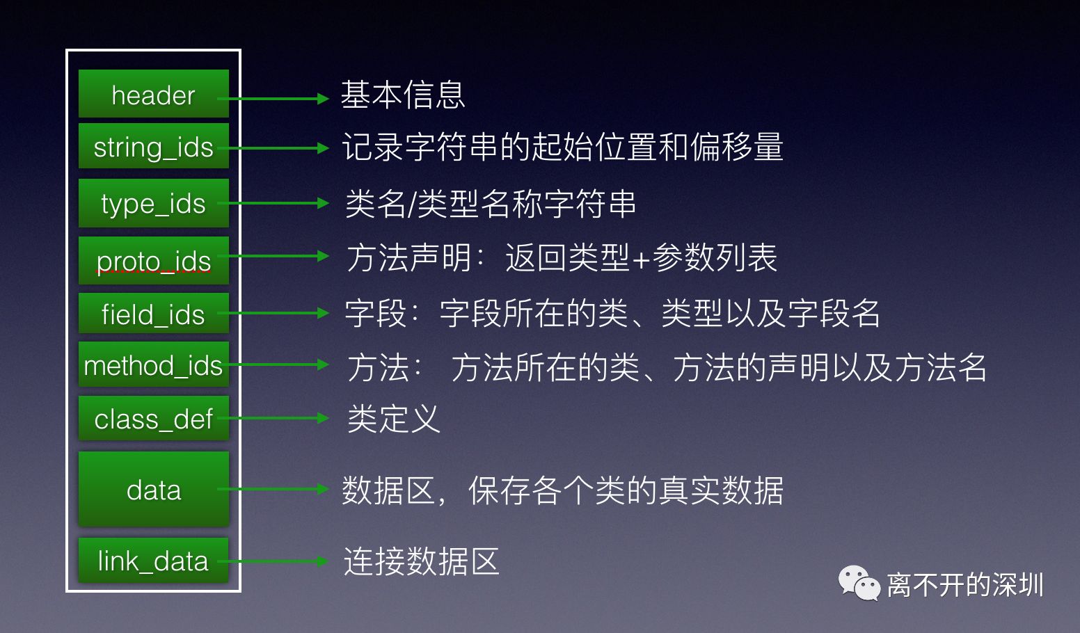 nuwa因为插桩,对运行的性能有不小影响;所以tinker从另一个方向出发进行修复:dex结构,我们先看dex的结构: