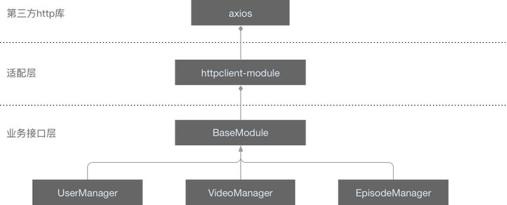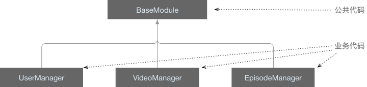 VideoManager、EpisodeManager、CPManager等。随着模块模块逐渐增多,我们发现重复的代码也在增多,需要提升代码的复用性,那么,可以给这些Manager模块定义一个基类BaseModule,然后将http库相关的代码转移到BaseModule中,从而子类中调用URL接口的方法。 - 后来发现,即使有了
