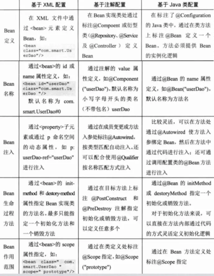 @Configuration 内部包含了@Component,说白了,当这个Bean加入到Spring容器中时,它内部标注了@Bean的方法返回的Bean都会放到Spring容器中。 具体的语法我不多说了。 @Configuration类想加入到Spring容器中有三种方式,一种是在xml里通过<context:component-scan base-package="...">扫描。一种是通过其他的Config类加上@Componentscan注解,作用是一样的,扫描配置路径下的POJO ,最后一种是在创建容器的时候直接指定这个config类,而不是xml配置文件,前面的博客讲到过。