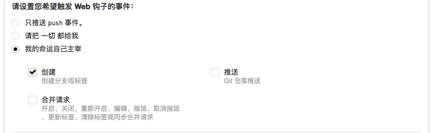 配置web钩子的时候改为下图,因为我们只需要知道新建标签的事件,其他一律不管。