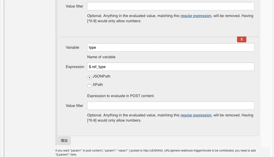 勾选Generic Webhook Trigger,添加两个post content parameters,记录版本号和推送类型。