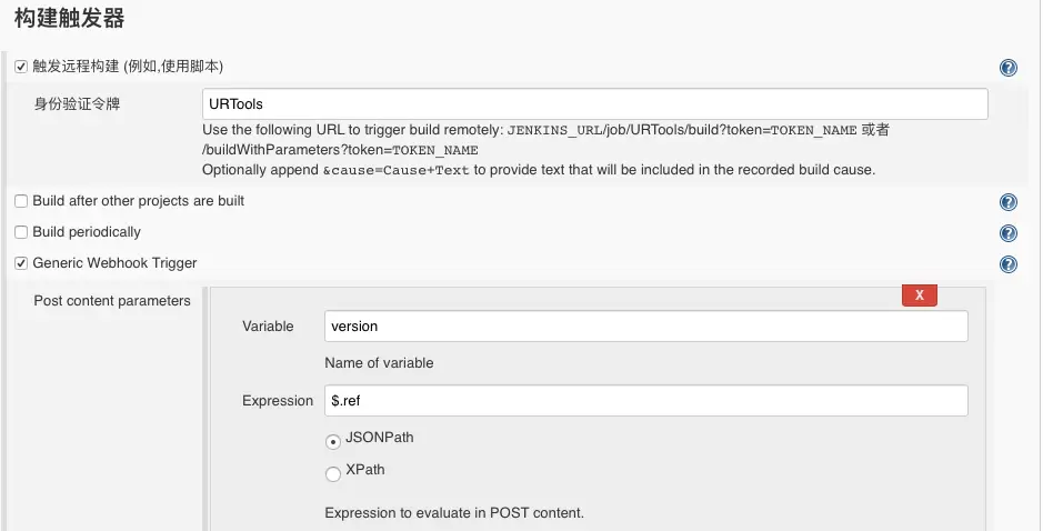 ref字段就是该push事件的版本号。我们可以根据这个字段去区分需要自动化构建的版本。ref_type字段用于表示分支类型,tag意味着新建版本标签。令牌填写项目名,用于唯一标识这个job,请记住不能重复。