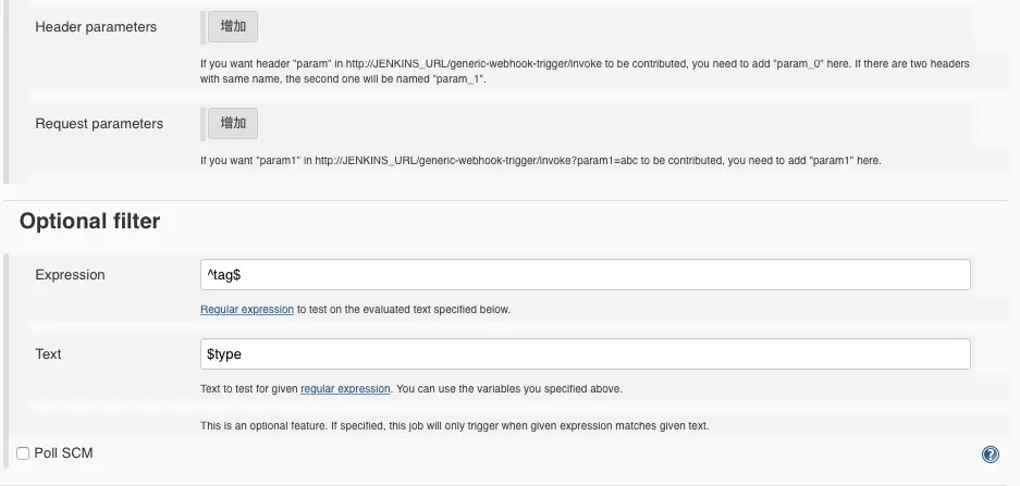 Optional filter用于区分触发构建的。只允许提交标签事件触发。 -