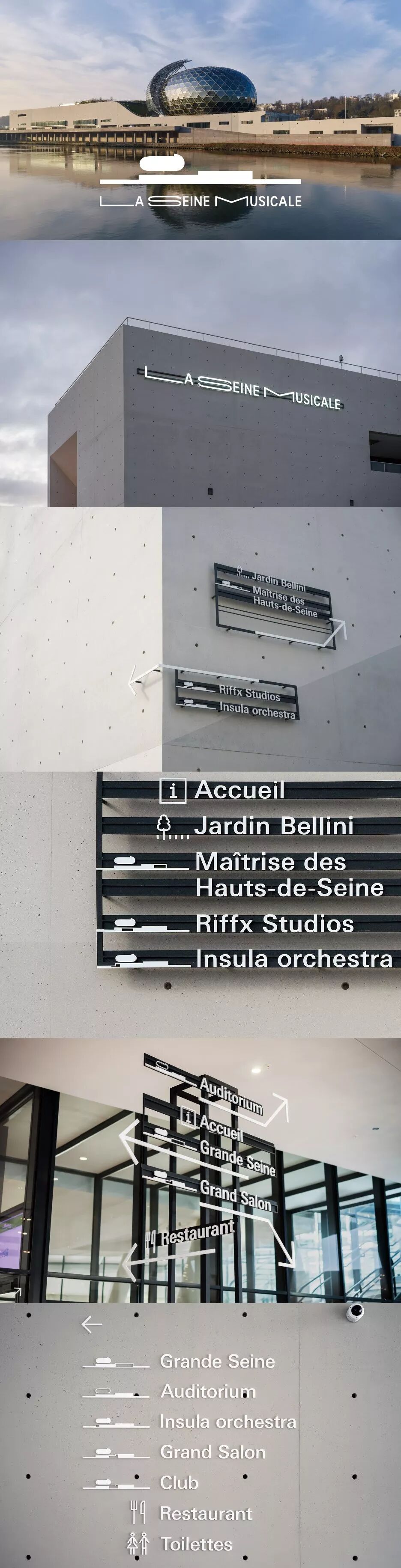 2017年4月,音乐表演艺术中心 La Seine Musicale 在巴黎塞纳河的Île Seguin岛上开放。建筑师坂茂设计了该艺术中心,原设计事务所则负责了标识及导视系统。