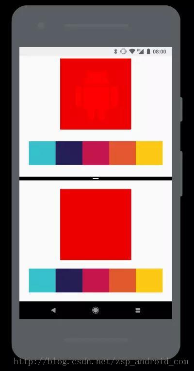 下面示例呈现两显示相同广色域测试图像界面(嵌入Display P3颜色配置文件的PNG文件),画面上部分Activity声明广色域颜色模式而下半部分Activity无声明。屏幕支持则上部分应能见一Android小机器人而下部分不见。