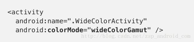 Android 8.0添一新widecg资源限定符(resource qualifier),该限定符可更改配备广色域屏幕并支持广色域渲染设备上颜色(nowidecg相反)。