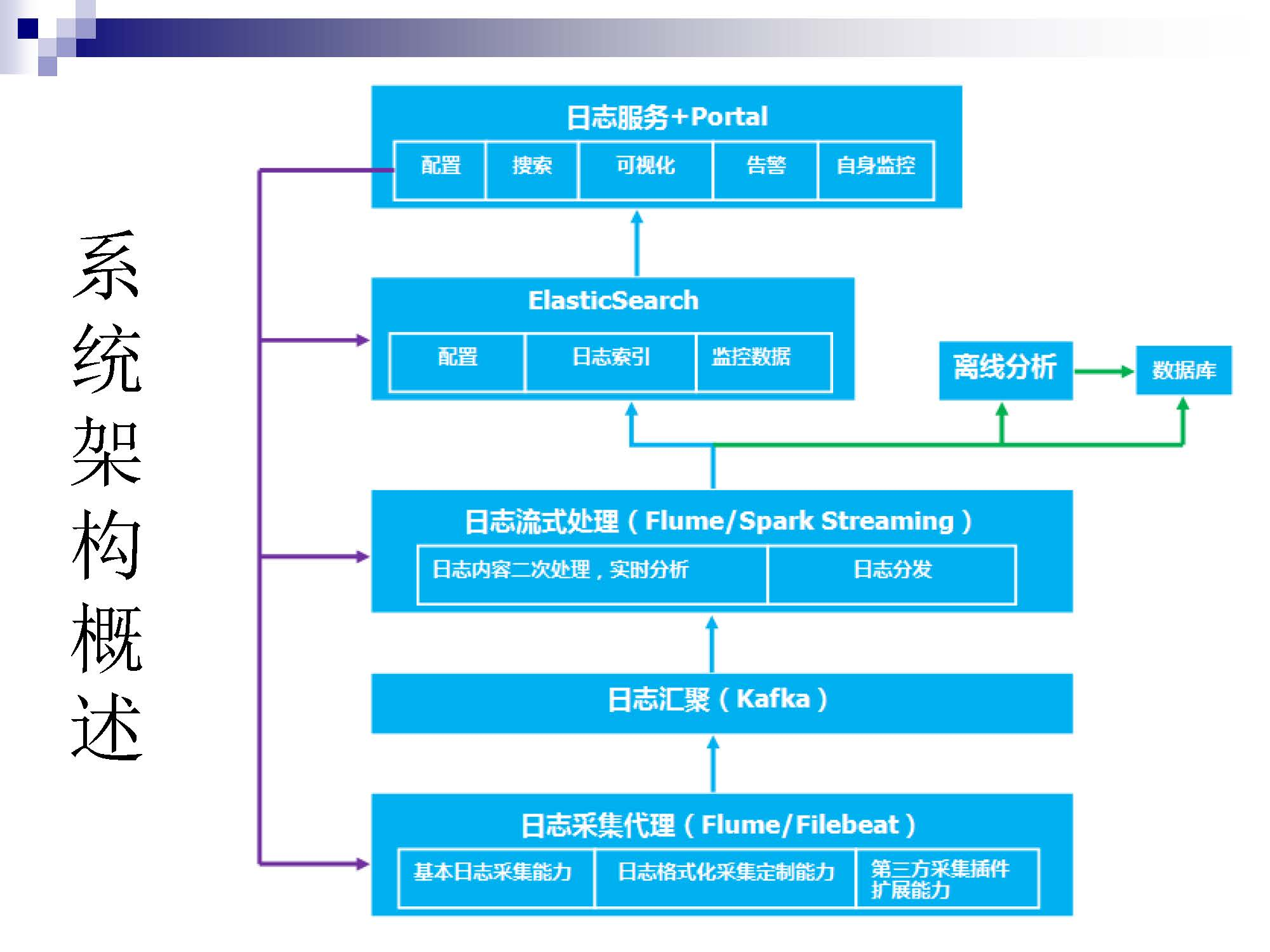 上图是我们的基础架构情况。最底层结合电信场景就是业务的节点,在业务节点上面会布一个采集代理,我们目前用的是Flume,因为资源和其它的一些关系,现在正在切换为Filebeat。
