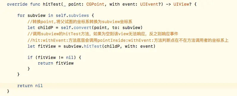 - 正因为hitTest:withEvent:方法可以返回最合适的view,所以可以通过重写hitTest:withEvent:方法,返回指定的view作为最合适的view。