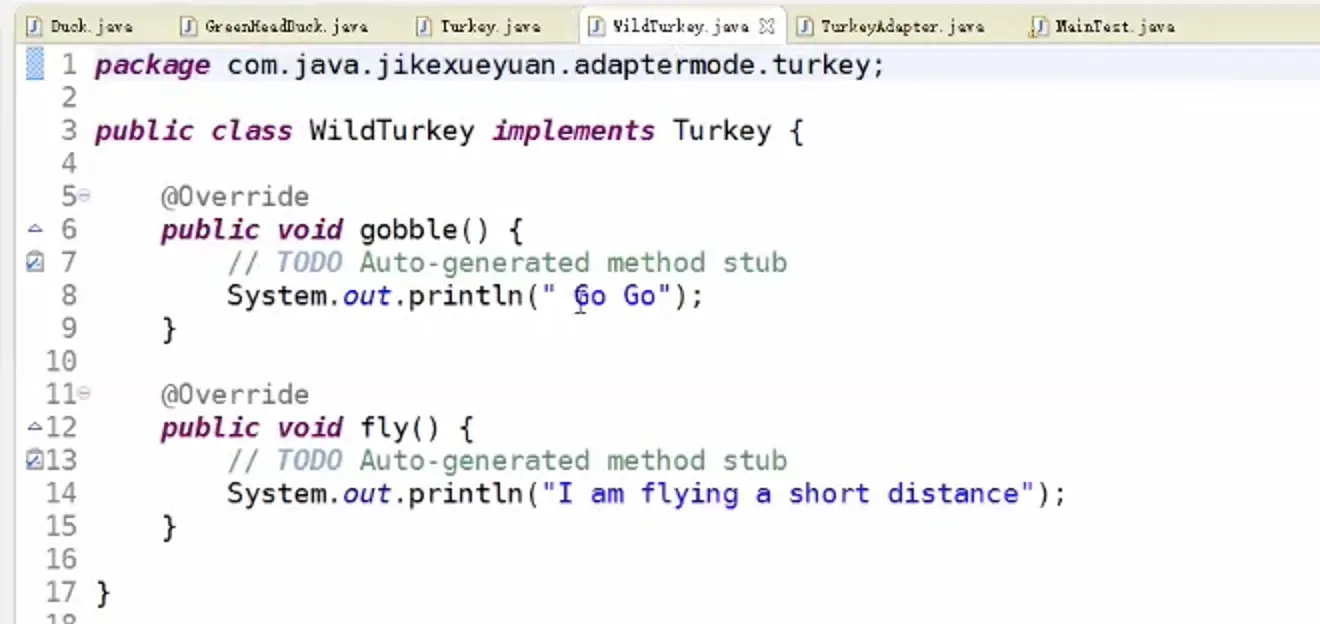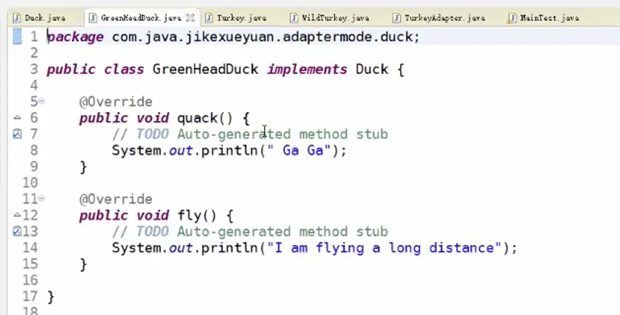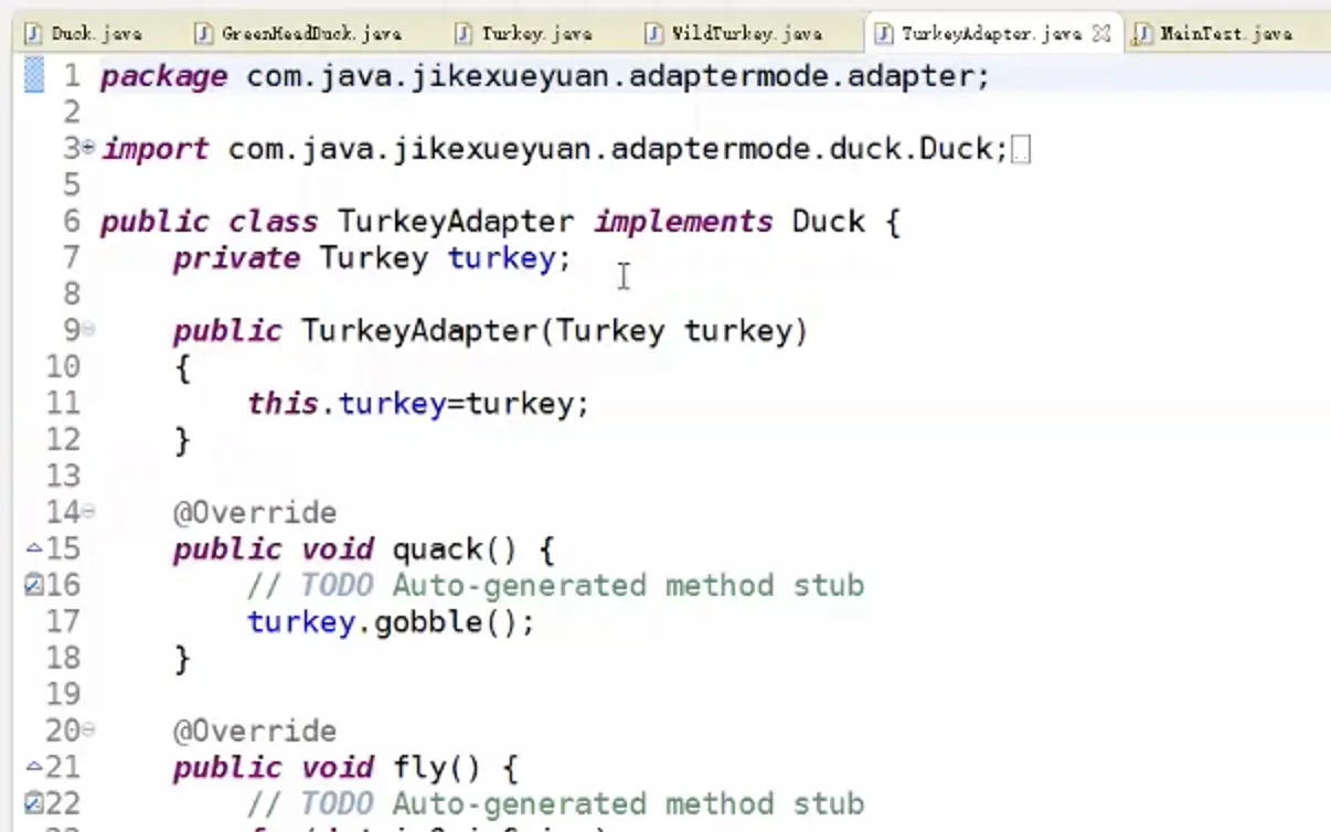 对外界人看来是一只鸭子,继承自duck接口,对外形象是一只鸭子的实现。但是是调用了火鸡的方法和内容,功能和作用都是火鸡的。