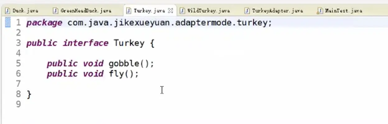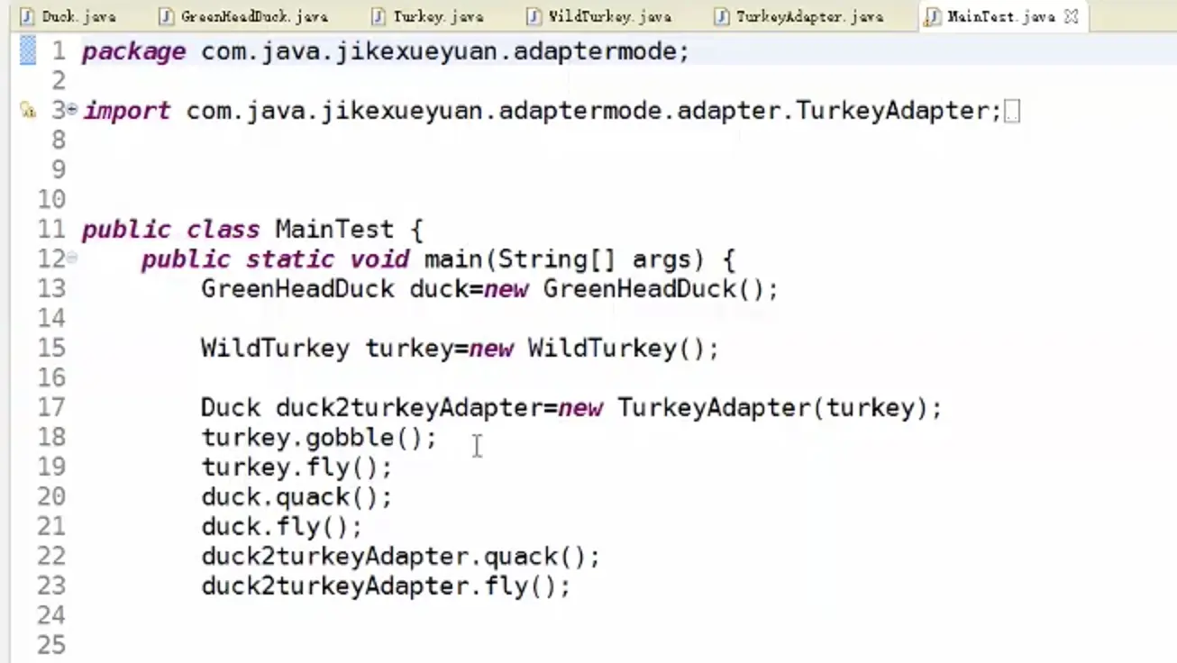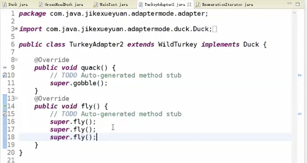 继承 被适配者类的部分 通过调用 被适配者类里面的方法来实现接口的功能(使鸭子具有火鸡的功能)