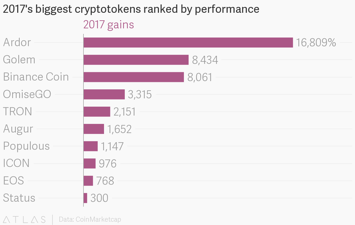 和这些新兴的数字加密货币相比,比特币的表现可能看起来有点平淡无奇,但依然值得把它的收益列出来。毕竟纳斯达克综合指数去年只上涨了 27%。很难想象 2018 年数字加密资产又会获得怎样的发展?