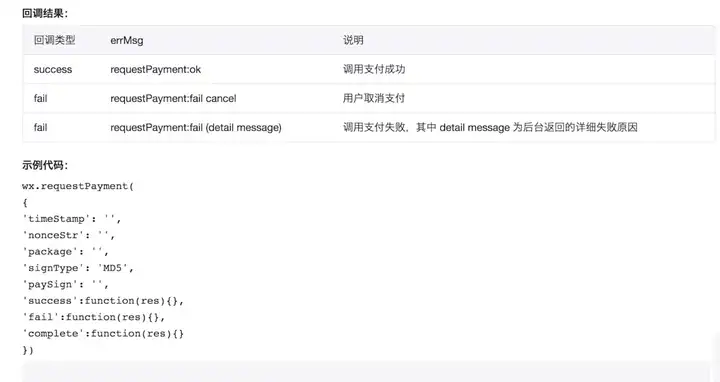 做过微信公众号的童鞋应该都知道,在公众号里商家H5页面内调用JSSDK就可以实现微信支付功能。但是看过webview组件的API的文档的童鞋应该知道:webview 里面的网页(公众号迁移的网页)是调用不了外部的微信支付what....... 虽然微信支付也确实是提供了小程序的微信支付API,但是因为我们整个小程序的内容就是一个webview嵌入公众号内容的网页,在网页内下订单的过程中是无法通过webview的api接口通知小程序调起微信支付的。 查看微信支付小程序的支付文档,我们小程序如果要调用微信支付只需要得到以下参数就可以。