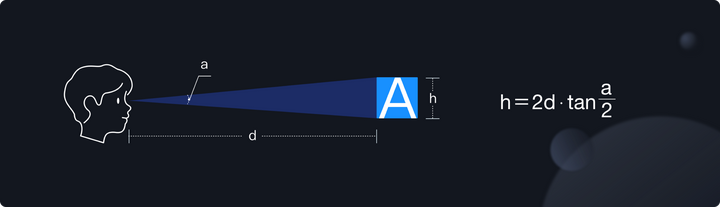 肉眼到物体之间的距离,物体的高度以及这个三角形的角度,构成了一个三角函数的关系。而公式中的 h 的值和我们要解决的核心问题『主字号』有着很大的关系。关于这个 a 的角度,有机构和团队做过研究,当大于 0.3 度时的阅读效率是最好的。同时我们在操作电脑时,一般来说眼睛距离电脑屏幕的平均值大概会在 50 厘米左右。然而,公式中的距离和高度的单位都是厘米,字体的单位是 pixel。因此我们还需要将二者之间做一轮转换,完成转换所需的两个数值分别是 2.45(cm 到 inch)和 PPI(inch 到 pixel)。