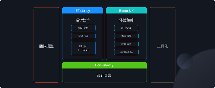 - Efficiency -- 高效 这部分对应的是我们的设计资产。设计资产除了基础组件库以及 pro 组件库(UI 资产)之外,还包涵设计资源、技术文档以及我们的设计资源。这部分是我们整个设计体系的起点同时也是基础。