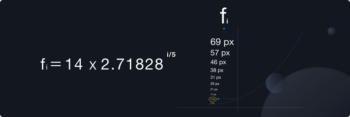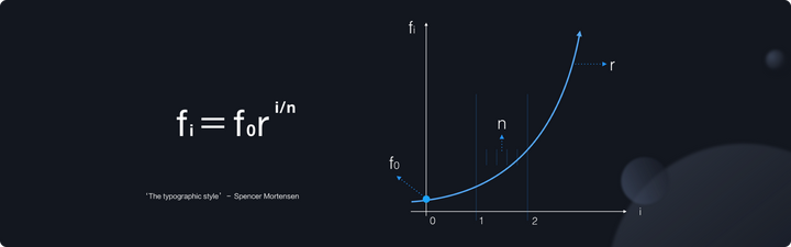 Robet Bringhurst 在他的字体样式元素一书中有提出过,定义有规律的字阶是构建设计秩序感的基础。同时他又提出经典的字阶和古典音阶具备韵律上的相似性。在这个思想的基础之上,有个叫做 Spencer 的人提出了一个幂函数的字体计算公式。用图形化来表达就是这样的。有了这一个公式,让一粒 14px 的字体种子种发芽的想法就变得不是那么的天马行空了。